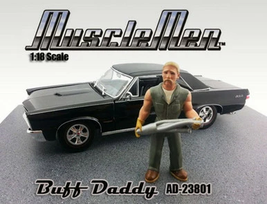This muscleman mechanic will take your car apart in no time. This The Buff Daddy Figure a detailed, realistic figurine, made by American Diorama for use with 1/18 Scale diecast vehicles.