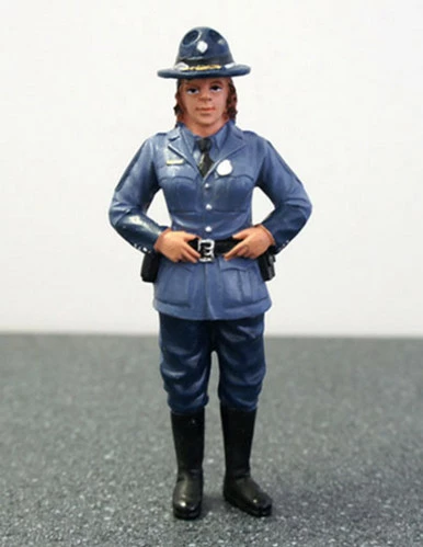 These figures won’t chase you down, but it’ll make your police cars look more realistic. The State Trooper Sharon Figure a detailed, realistic figurine, made by American Diorama for use with 1/18 Scale diecast vehicles.